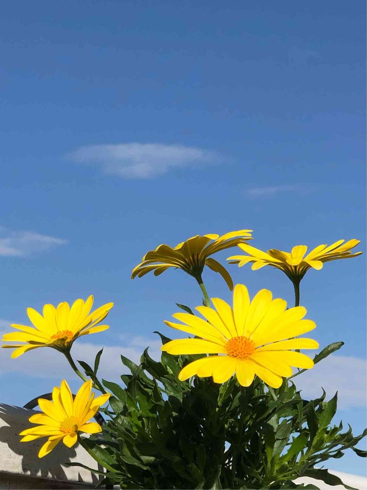 こんにちは。青空をバックに愉しげに咲く黄色お花が、元気付けてくれますね。オステオスペルマム、とても素敵です。