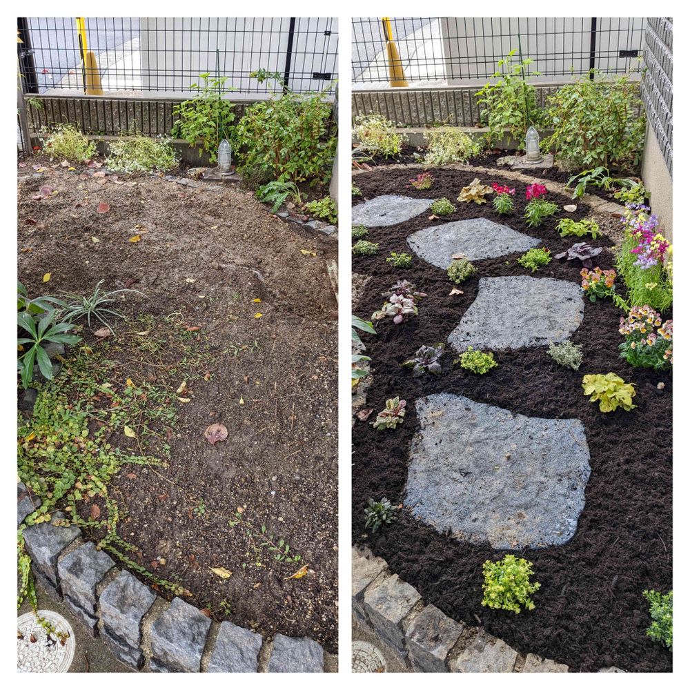 ちょっとビックリするくらい石(たまに岩)がゴロゴロ出てきたり、めっちゃ粘土質の箇所があったりでしたが、ようやくフカフカまでたどり着いたので苗を植えてバーク堆肥でマルチングしました。