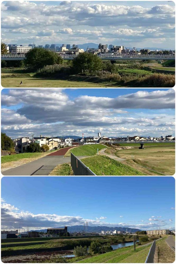 picは、自宅裏を流れる藻川の堤防からの風景、上は梅田方面、真ん中は生駒方面、下は六甲方面です。