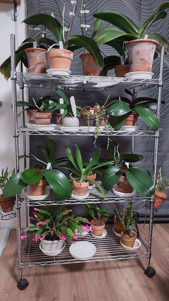 風除室からデンマークカクタスとチマヨせを連れてきて、花芽がでている胡蝶蘭とデンドロをあれこれ入れ替えしては棚の高さを変え、冷える床に近い一番下の段に寒さに強いデンマークカクタスとデンドロ。苦肉の策でサイドにもカゴをくくりつけたし😅