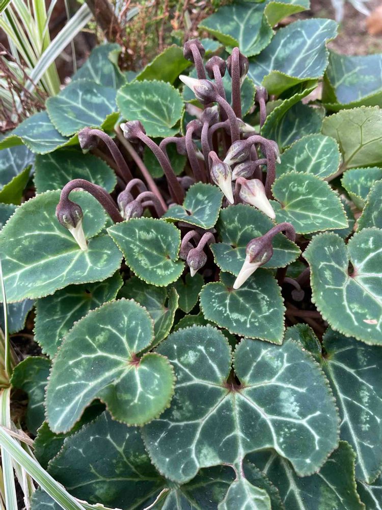 夏越ししたシクラメンの花芽が上がって来ました😊花と葉っぱ増やすためせっせと葉組みしてます