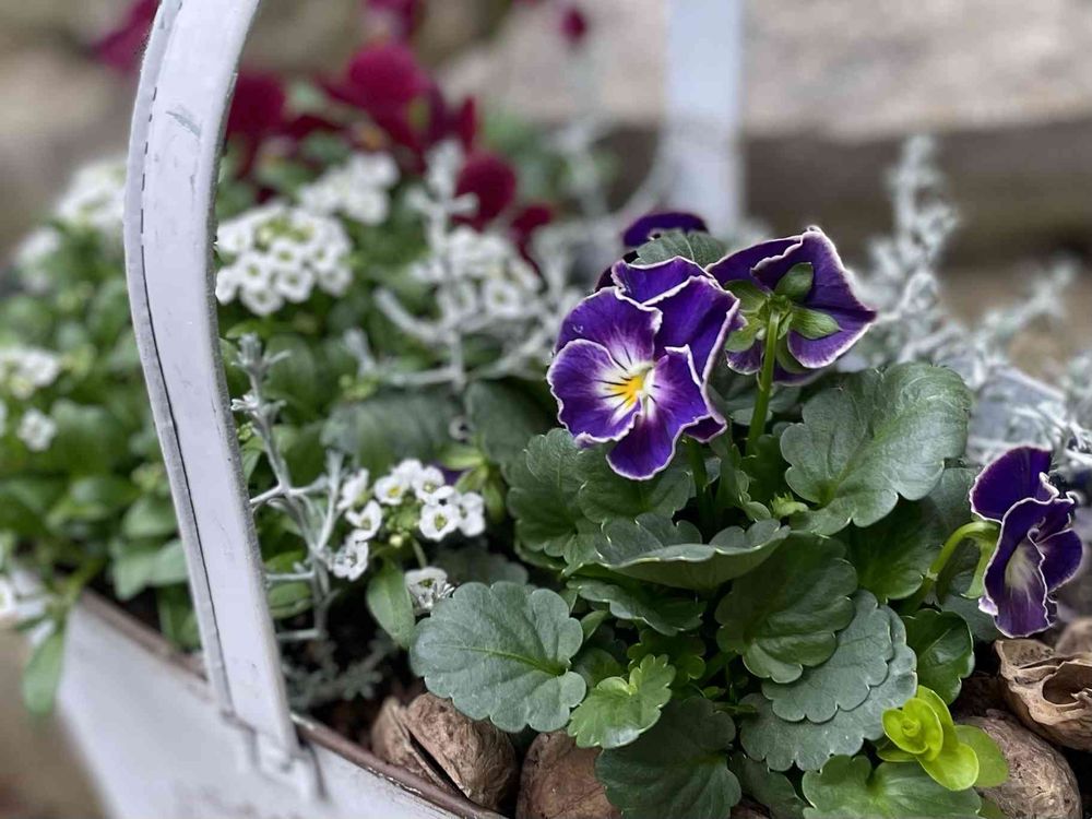 エンジのビオラ、アリッサム、シルバーリーフの形が個性的なカロケファルス、我が家の庭に生えているリシマキアオーレア、斑入りワイアープランツ、掘り上げクロッカスも仕込み、寄せ植えしました♡