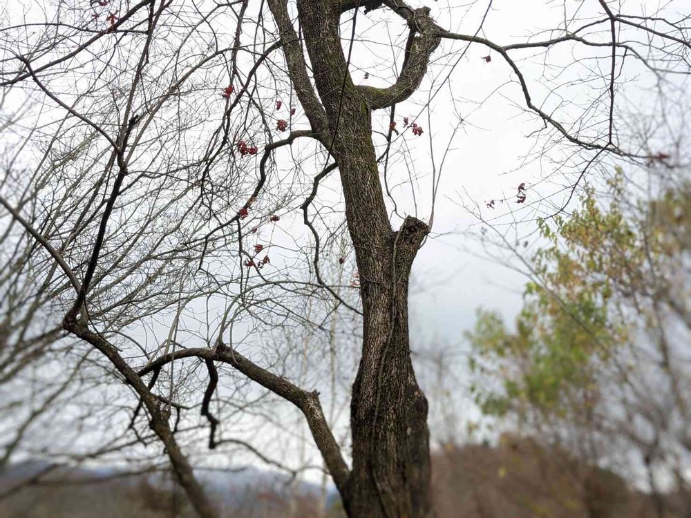 今年も屏風絵のような美しさを見せてくれたイロハモミジの斜面側の枝には 紅葉葉はもうチラホラ…🍁