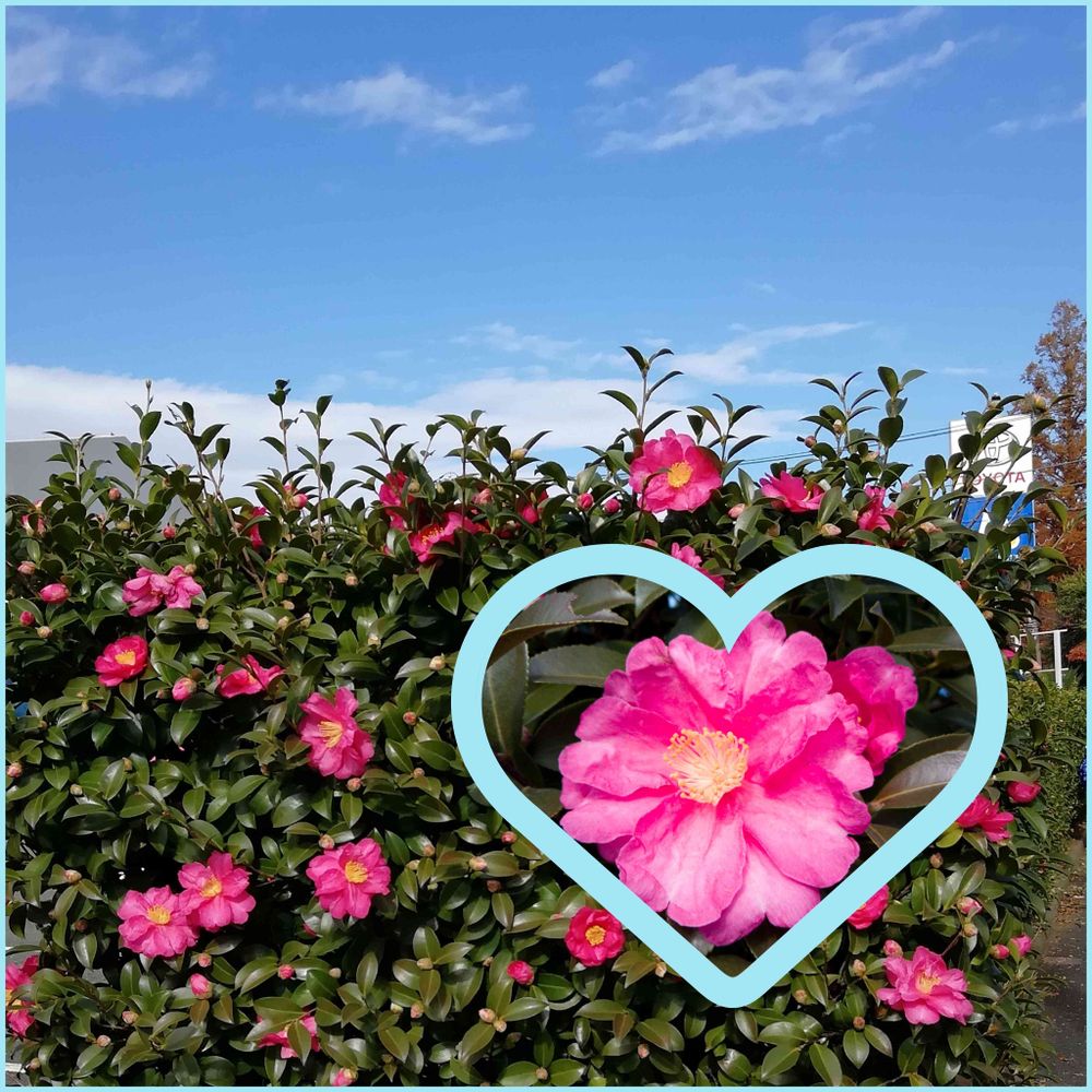 沿道の垣根の山茶花青い空に赤い花が綺麗でした🎶