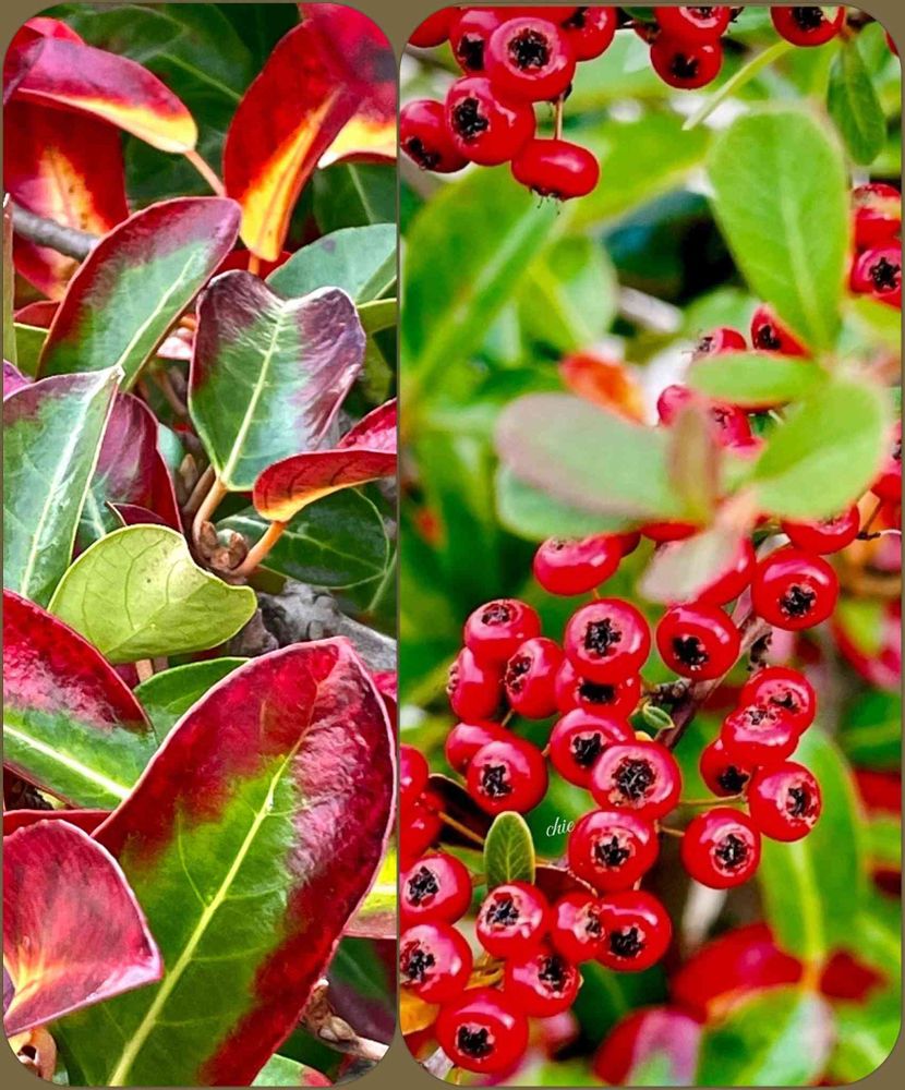 ピラカンサの真っ赤な実とサンゴジュの紅葉が彩り鮮やかに寄り添ってます。花言葉は「燃ゆる想い」🌿🐈🤍♪