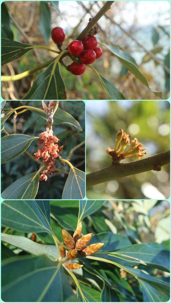 ⬆️ 赤い果実が有ると言う事は雌株ですネ。➡️ 他の木ですけど雌花です。残骸っぽいけど、雌花です。⬅️ は雄花の残骸。⬇️ は冬芽(葉芽)です。常緑ですけど、来春、個性的な芽吹きを見せてくれます。乞うご期待。