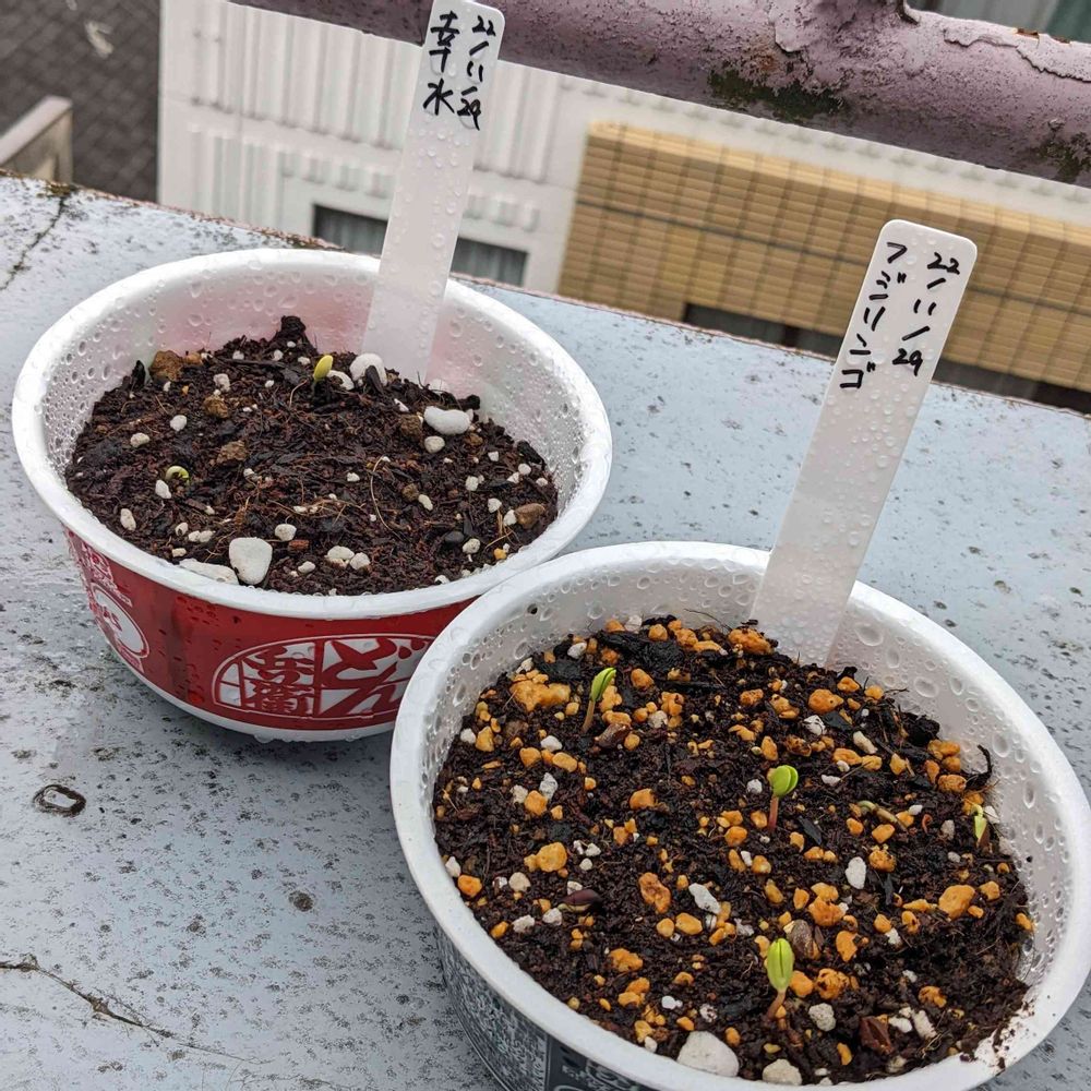 アボカド育ててみたくなって家で食べたものをひたすらポットに植えています。その他家で食べたフルーツの種をアボカドと一緒に実生苗にすべく日々観察中です。