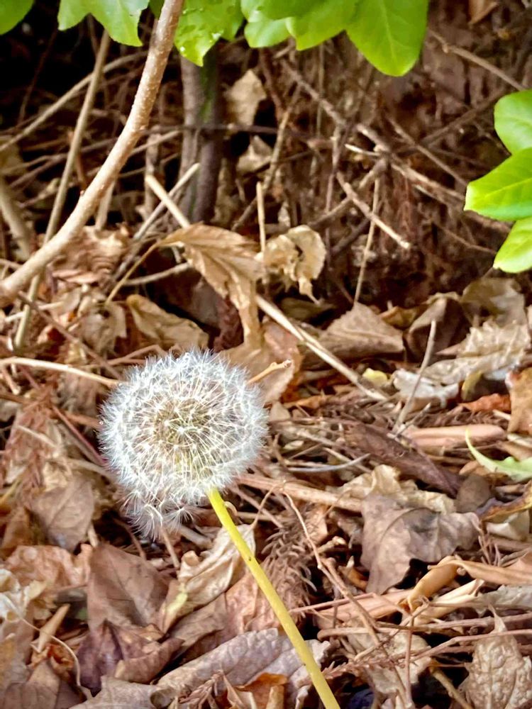 夜中からの、みぞれ雪も何のその、植え込みのツルマサキに見守られて?12月のたんぽぽの綿毛は凛としてます。🤗