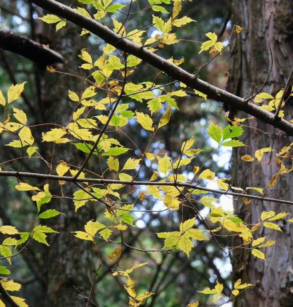 木々が次々と葉を落とし冬姿となる山中、針葉樹の暗い深緑を背景に明るく日を透かす樹が目をひきました。