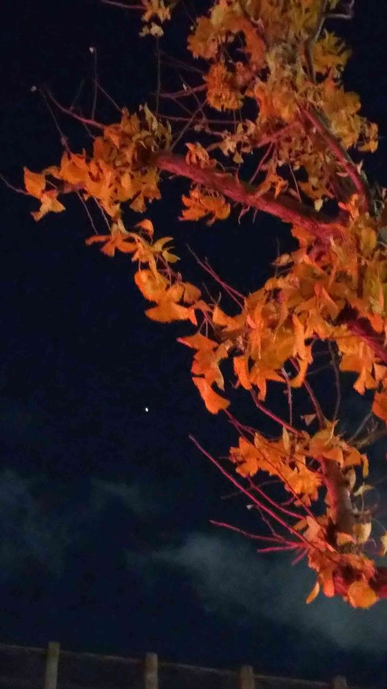 通勤帰り、車のライトで赤くなった「トウカエデ」の向こうに木星🌟が見えます。🌌🏙️🧡♥️⭐️😊😄✌️