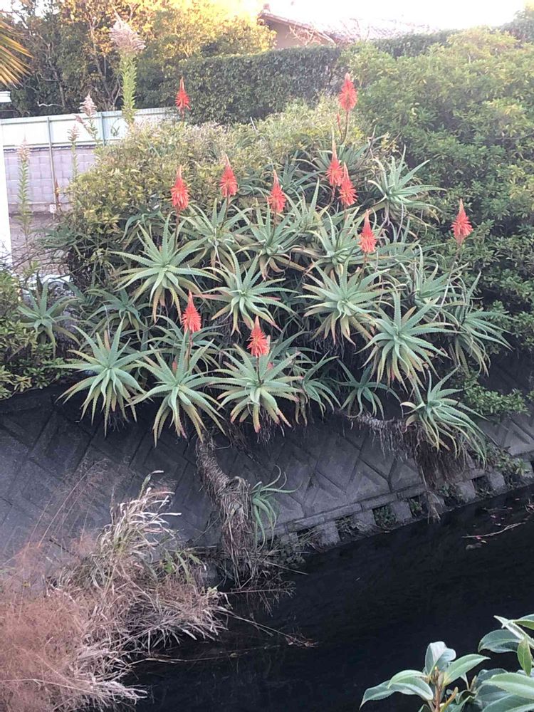 あのアロエの裏をももちゃんと歩いてて、アロエの花がニョキっと