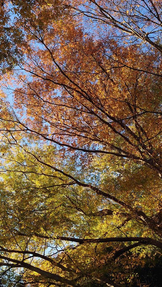 見上げると🤔、紅葉🟥&黄葉🟨&青空🟦のコラボでした😮🥳(農業試験場内の遊歩道にて)