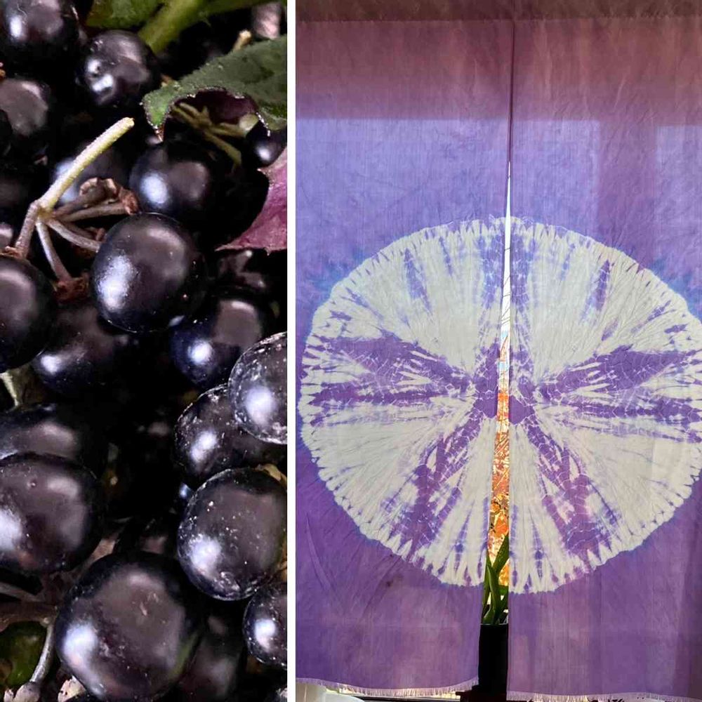 零れ種から今年も収穫出来ちゃいましたが、熟させても毒性が気になって、解した着物の裏絹を染めて、暖簾を作ってみました^ ^色の定着の為の媒染には、焼きミョウバンで、二度染め時の色むらがいい感じになってくれました^ ^