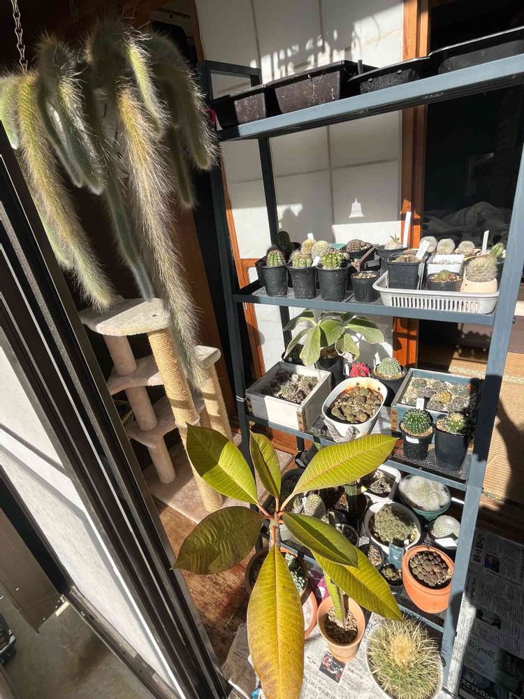 サボテンたちの為にキャットタワーは隅に追いやられました😅他の部屋にもタワーはあるし、猫ちゃんは自分で歩けるから🐾冬の間はサボに譲ってねってことで😁