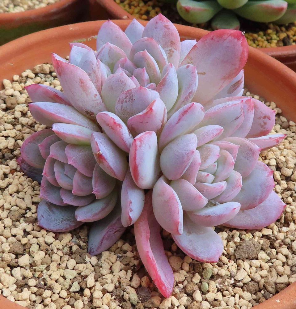 去年の今頃は,薄い色ではあったけど,まだ緑が残っていた。今年は一変して白にピンクという色の組み合わせ。夏の青白い色とも違って,まるで違う種類のエケベリアを見ているよう。