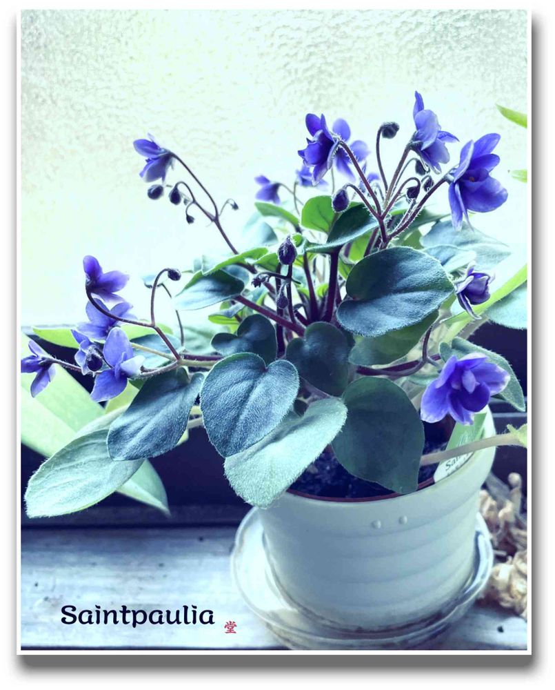 ♧書斎の窓辺で、小生の好きな青紫の可愛いセントポーリアの花が5割・半分ほど咲きました🐶