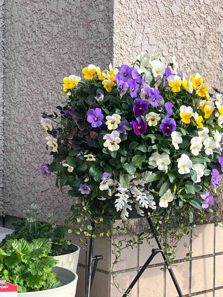 素敵なビオラのハンギングバスケットを見つけて嬉しくなりました。