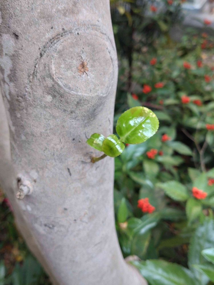 庭のツバキ 幹から現れた新芽?が可愛いな