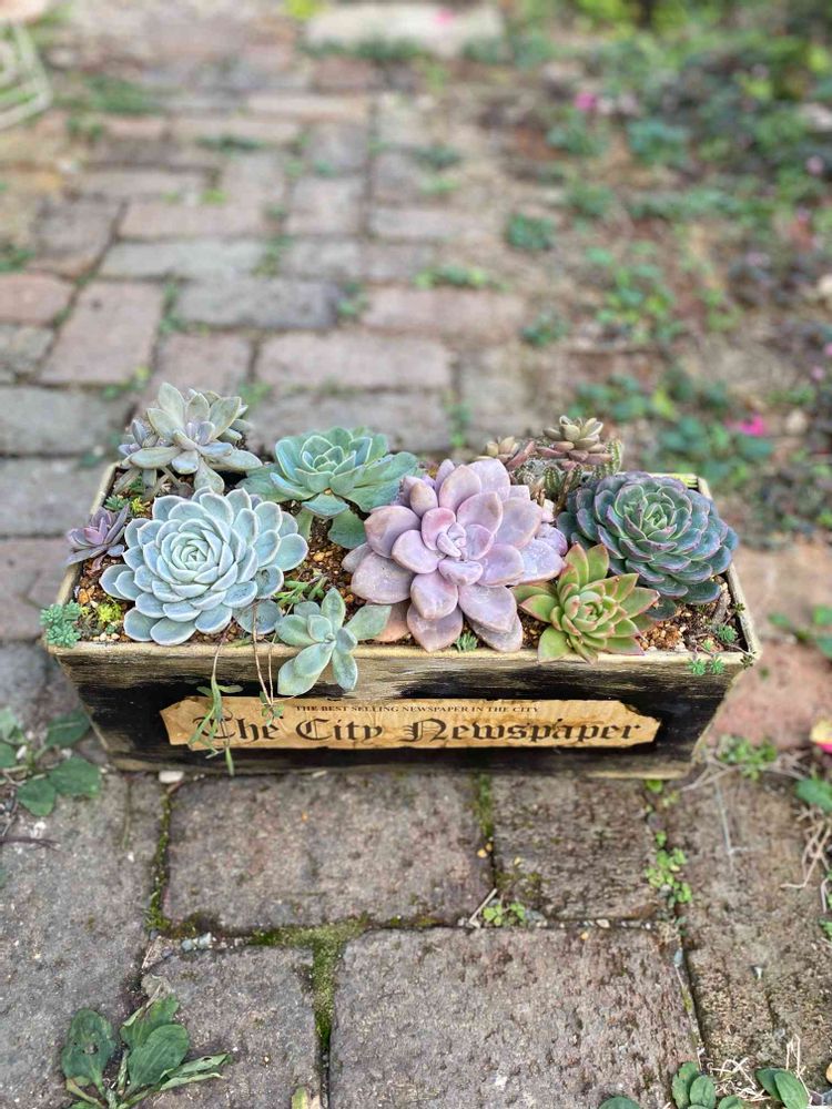 お一人様にしようかと思っていましたが、パン屋さんのケースにリメ缶したものがあったので、寄せ植えにしましたが、ちょっと大きすぎて、ドカドカした感じ😓葉挿しもいっぱい出来たので、よしとします👍