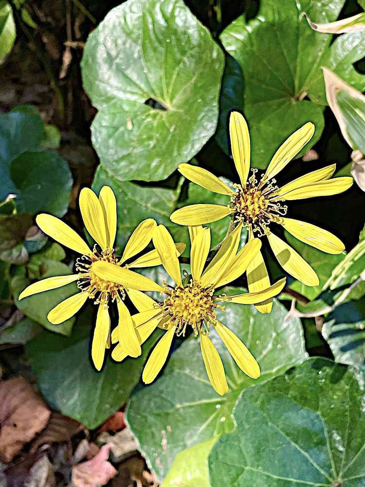 そこには、大きく厚みのある幾つかの照葉の中から、花茎を長く伸ばした3つの、黄色の花径5㎝前後の頭花を咲かせていた。