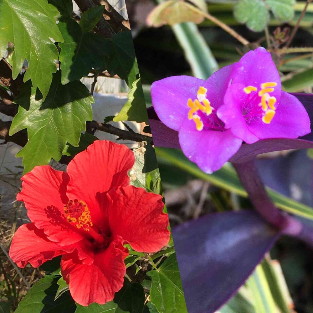 まだ、路地で頑張っているハイビスカス🌺さんと、紫御殿の花💕 寒いけど、日差したっぷりだから頑張れるのかな?鮮やかですよね😊