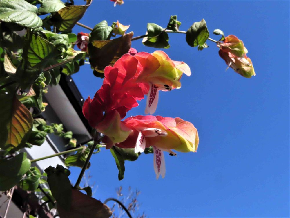 綺麗に咲いた「コエビソウ」、秋晴れの空をバックに パチリ