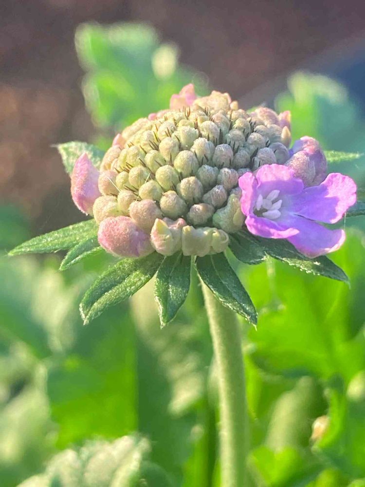 朝陽を浴びてスカビオサが開き始めました💜花言葉は「再起」