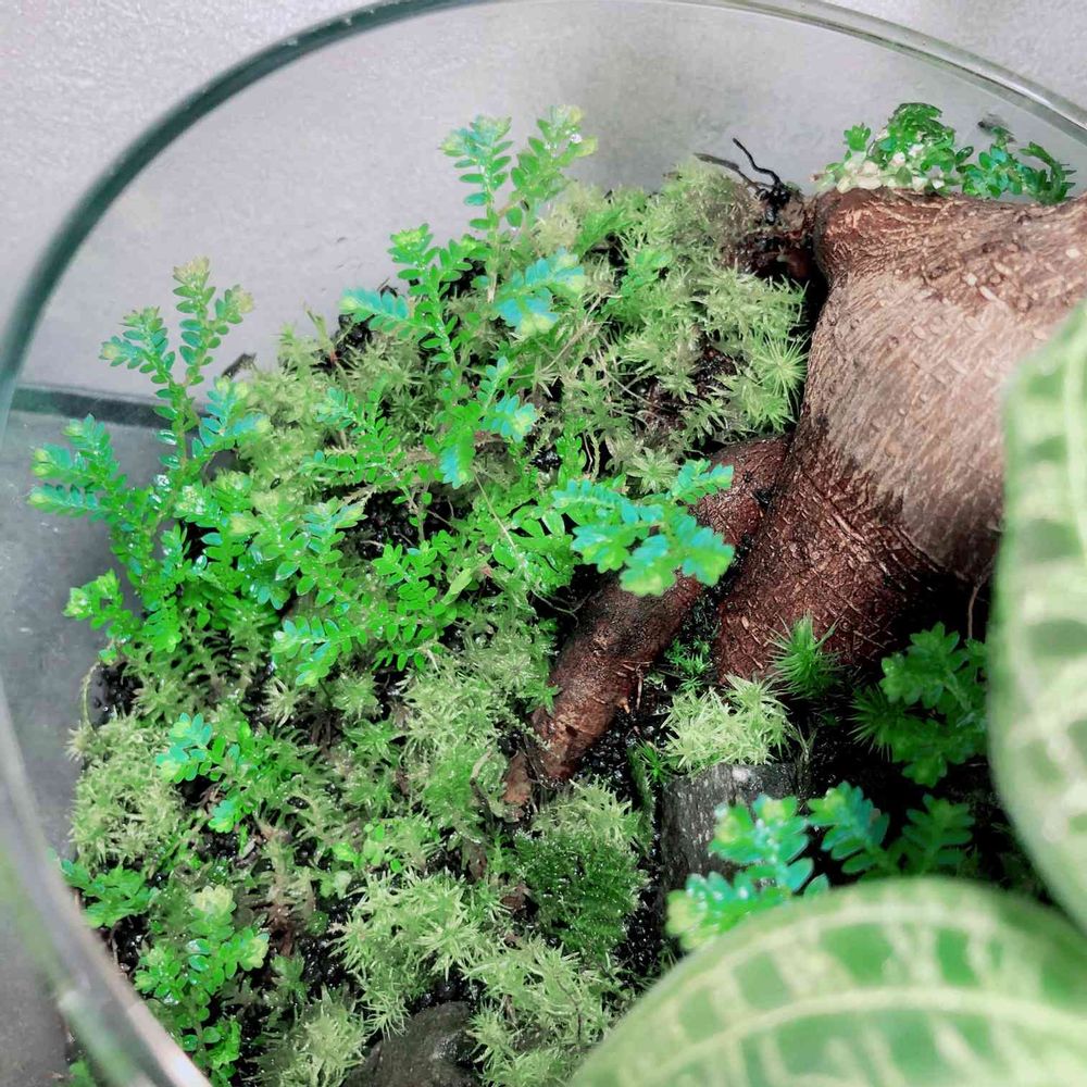 このテラリウム、ガジュマル植えてマコデスペトラ植えてレインボーファン植えてて苔の勢力が削られていってる気がするw