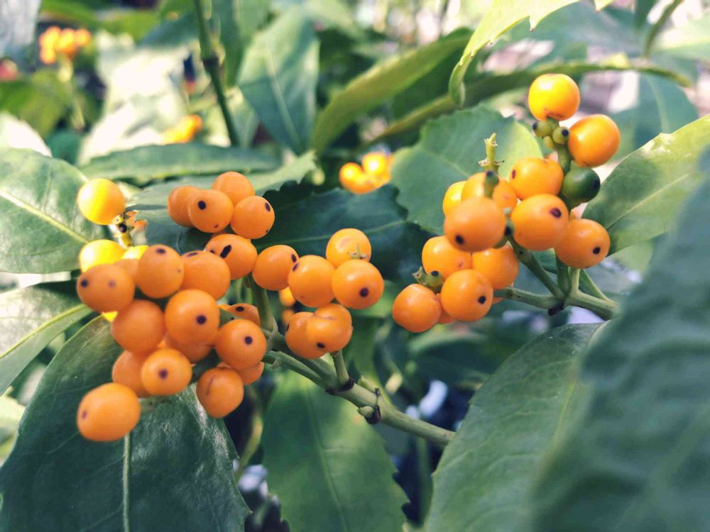 葉上に果実を成らすセンリョウ科センリョウで、冬にキミノセンリョウは黄色い果実をつけます。 葉に光沢があり、薄く、皮質で、葉縁に鋸歯があります。 庭木、寺木、床飾りの寄せ植えや、生け花等に用いられるそうです。