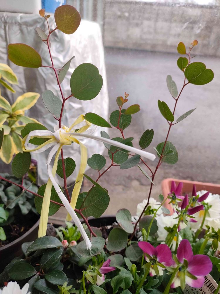 玄関のユーカリポポラスさんに、リボン🎀付けて、みました。