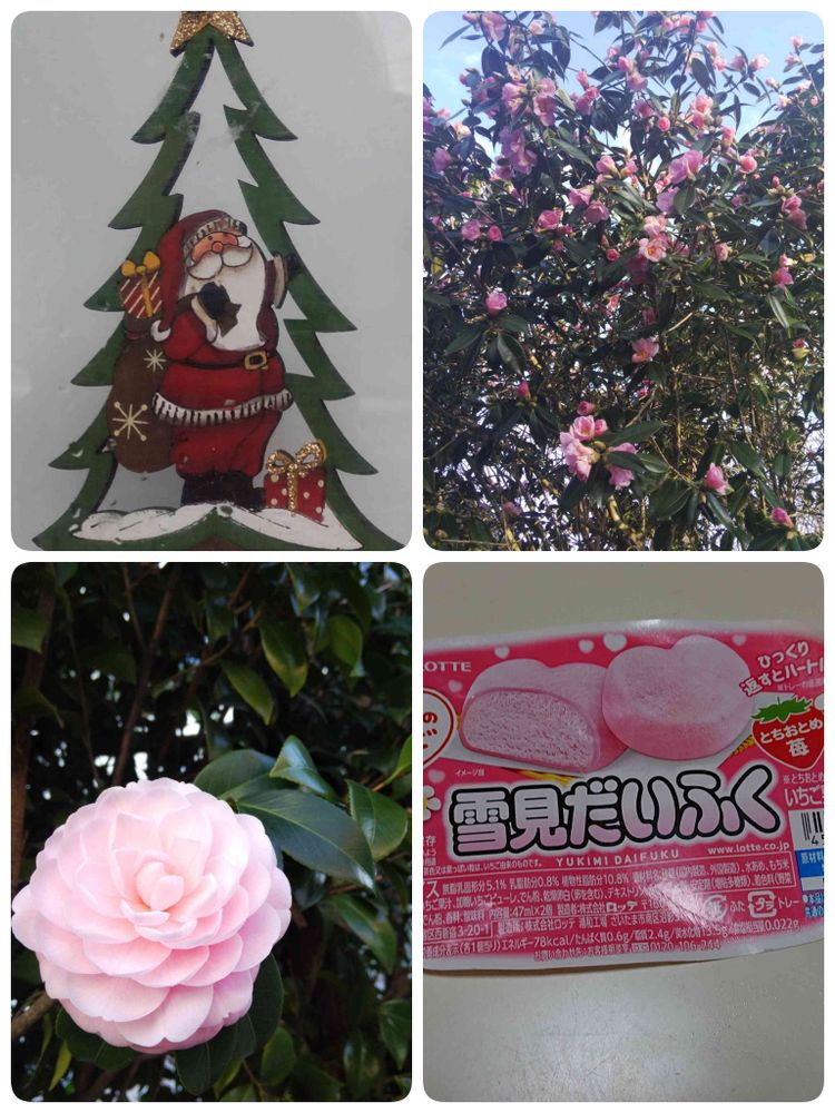 ゆっくりの朝です😂すっかり🎄サザンカさん♪八重咲きですね😉口内炎に冷たくて喉越し良くペロリです。少しチンで🍓💗です。食べたい物が食べられる幸せ😆🍀