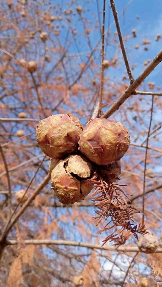 ヒノキ科ヌマスギ属の落葉高木。北アメリカ原産で明治時代に渡来した。沼地や川辺などに生育することもできることから沼杉とも呼ばれる。湿った場所に生えている場合は、周囲の地面から地上に出て呼吸をする『膝根(しっこん)』『気根(きこん)』と呼ばれる呼吸根が柱状に直立することが多い。これは他の木にはない特徴で、水浸しになると根は呼吸困難になるので、根に空気を供給する働きをする。葉は、水平に並んだ鳥の羽根のように互生し、よく似たメタセコイアの葉は対生する。花期は3~4月で、黄緑色の小さな花が多数集まって10~20㎝の花房をつくり垂れ下がる。毬果は球形で径約3㎝。10~12個の果鱗からなる。果鱗に種子は1~2個。種子は茶褐色でヤニがつく。薄い翼があるが、毬果が熟すと開いた果鱗についたまま飛ぶことなく落ちる。
