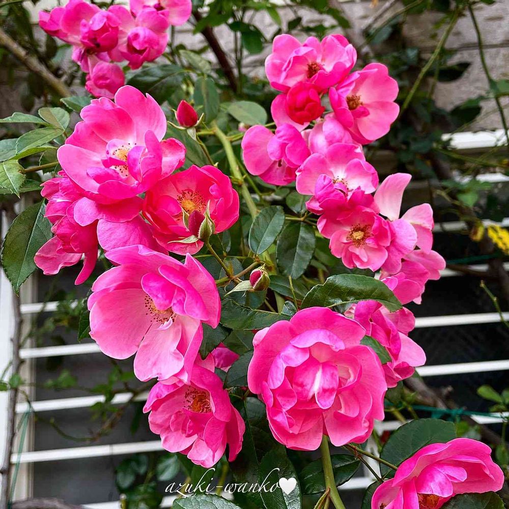 アンジェラ(Angela)、濃いピンクのゆるいカップ咲きで、房咲きの花は満開時には圧巻されるほどに綺麗なつるバラですよね。