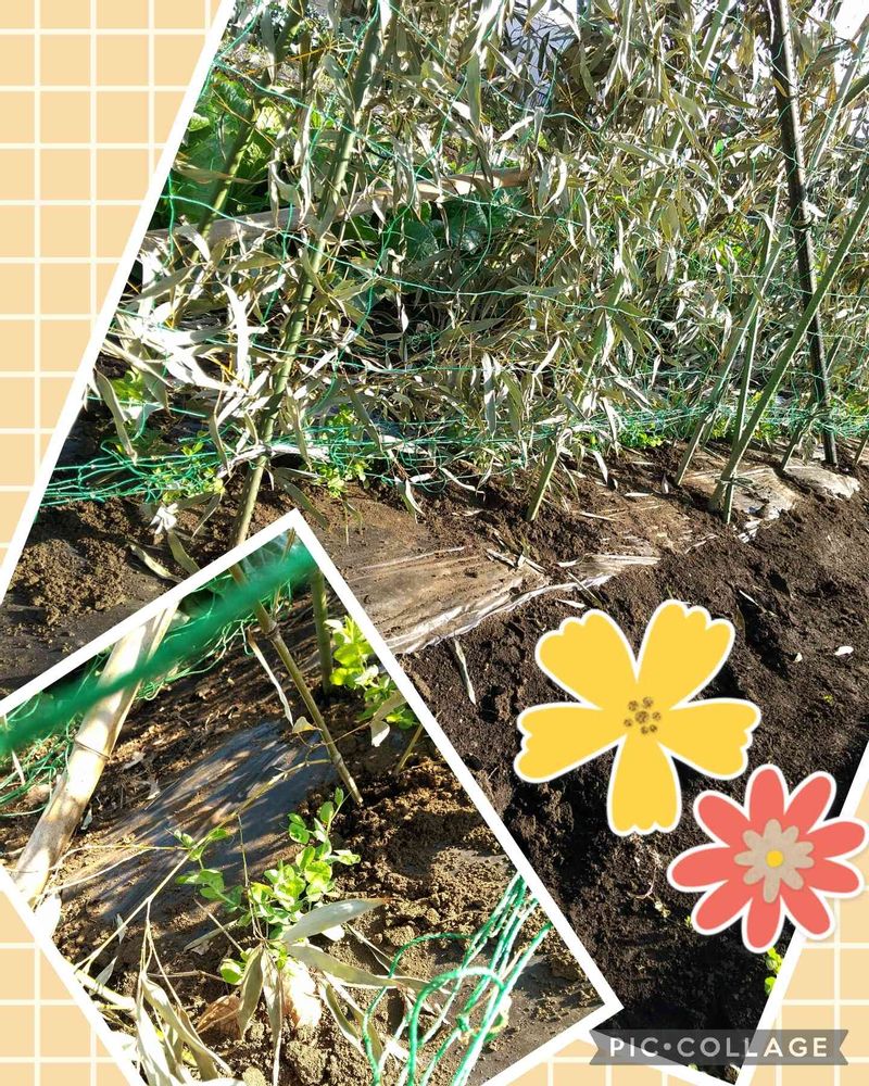 絹さやとスナップエンドウの支柱を立てて、霜除けの為に孟宗竹の枝葉も立てました😉