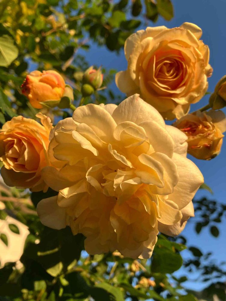 淡いアプリコットのバラが夕陽を浴びてエッという姿で