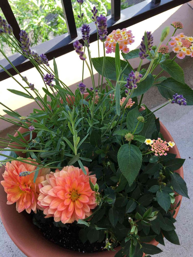 ランタナ、イングリッシュラベンダー、ダリア、ミニバラ(白)。