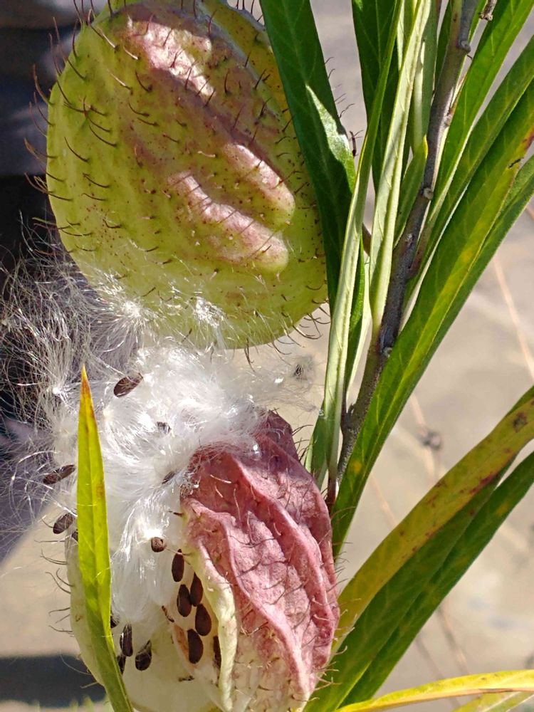 フウセントウワタ(キョウチクトウ科)の綿毛がはじけて、今にも飛び立とうとしています💚