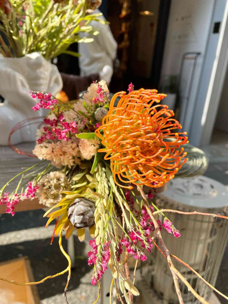 自然光を浴びたお花の姿、美しやー☺️✨ オレンジ色のピンクッション、艶々しててお花とは思えないような光沢感に見惚れてしまう😳✨ 観察するほど、、楽しい🎨✨