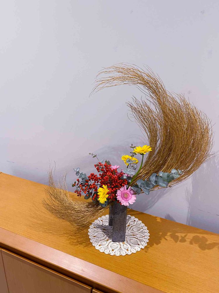 ホウキ草の色がくすんでいるので、お花はパッと明るく、南天の実とガーベラを選んでみました。