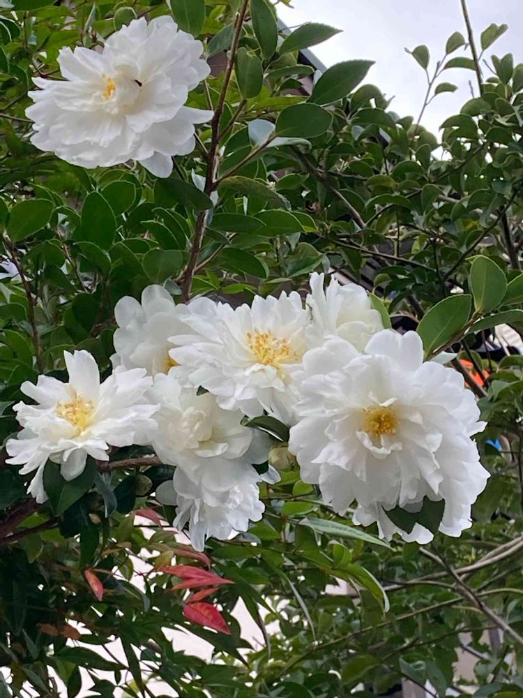 ご近所さんの白花八重咲きサザンカが綺麗に咲いてます。