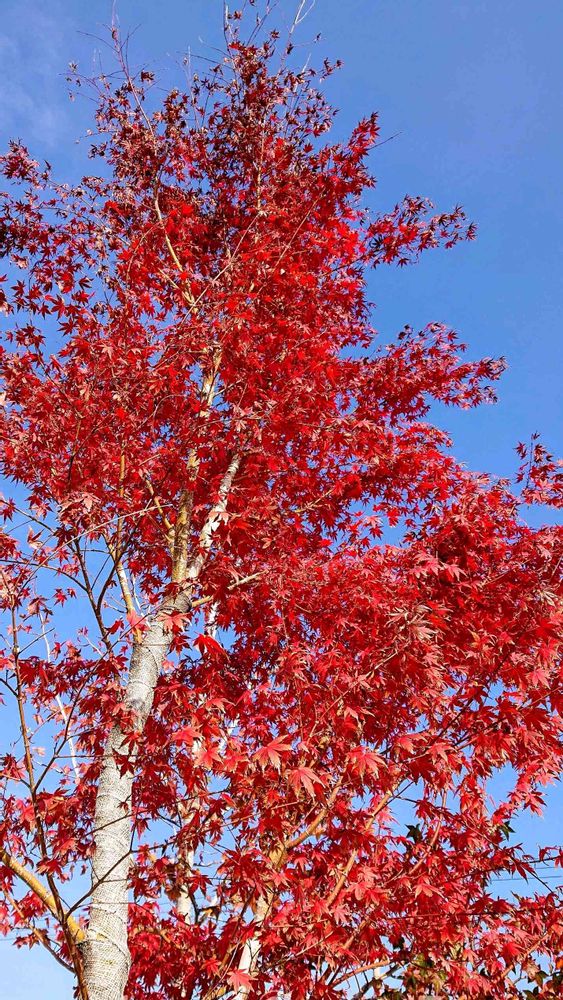 新しく建て替えたUR団地の公園に植えられたもみじ🍁真っ青な空の下まだまだ幹も細く背も低いけど、紅葉を見て欲しくて見た目は大きな木に見えませんか?