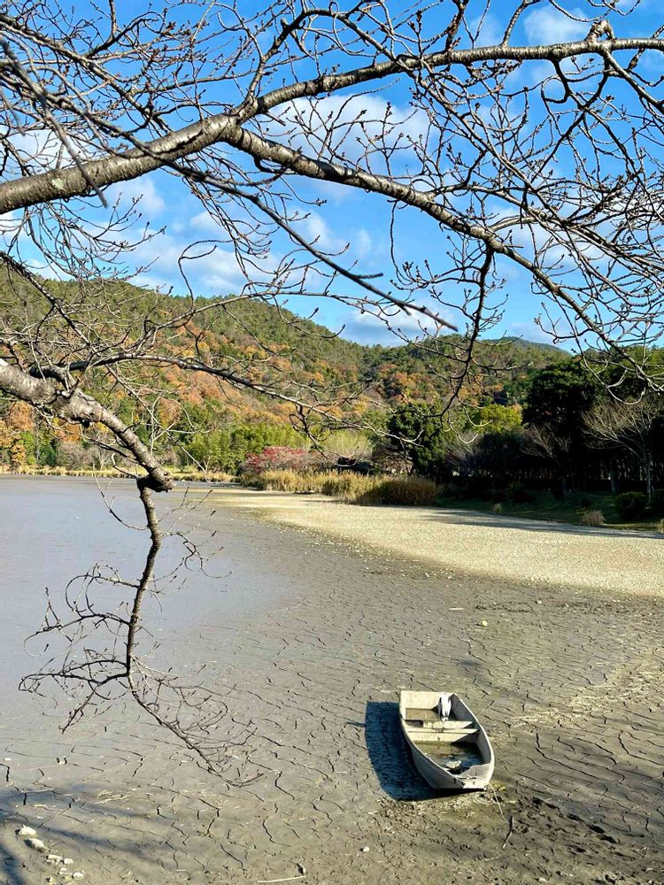 広沢池のほとりの木の葉もすっかり散って、水を抜いた池には、アオサギを乗せたボートがポツンと一隻🚣♀️