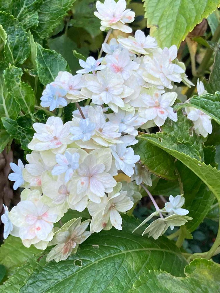 こんばんは😊今朝の放ったらかしガーデンにて。秋に発見したアジサイがまだ頑張って咲いてました。四季咲きじゃないはずなんだけど...あなたは美しく偉い‼️
