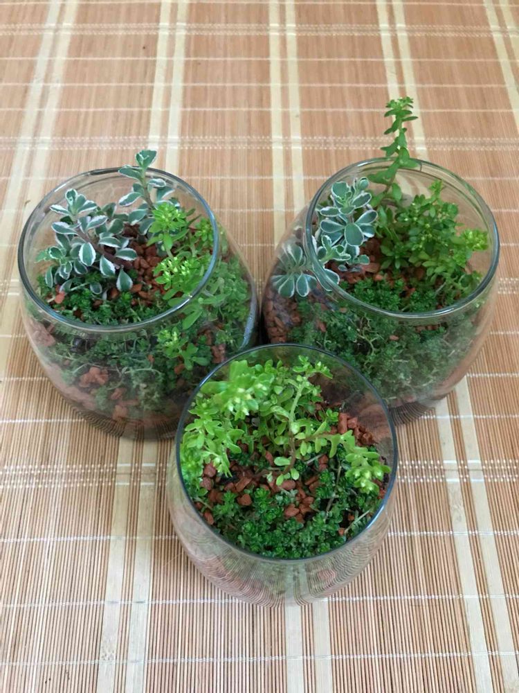 売ってるの?へぇ、そうなのか。……から見方が変わり、お友達のプレゼント用に、100均で買ったグラスに寄せ植えをしてみました。