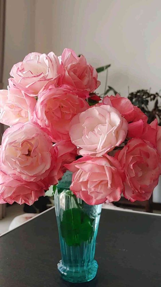 春みたいに咲いてきました。ひと枝に七輪くらい咲くので好きな薔薇です。😊