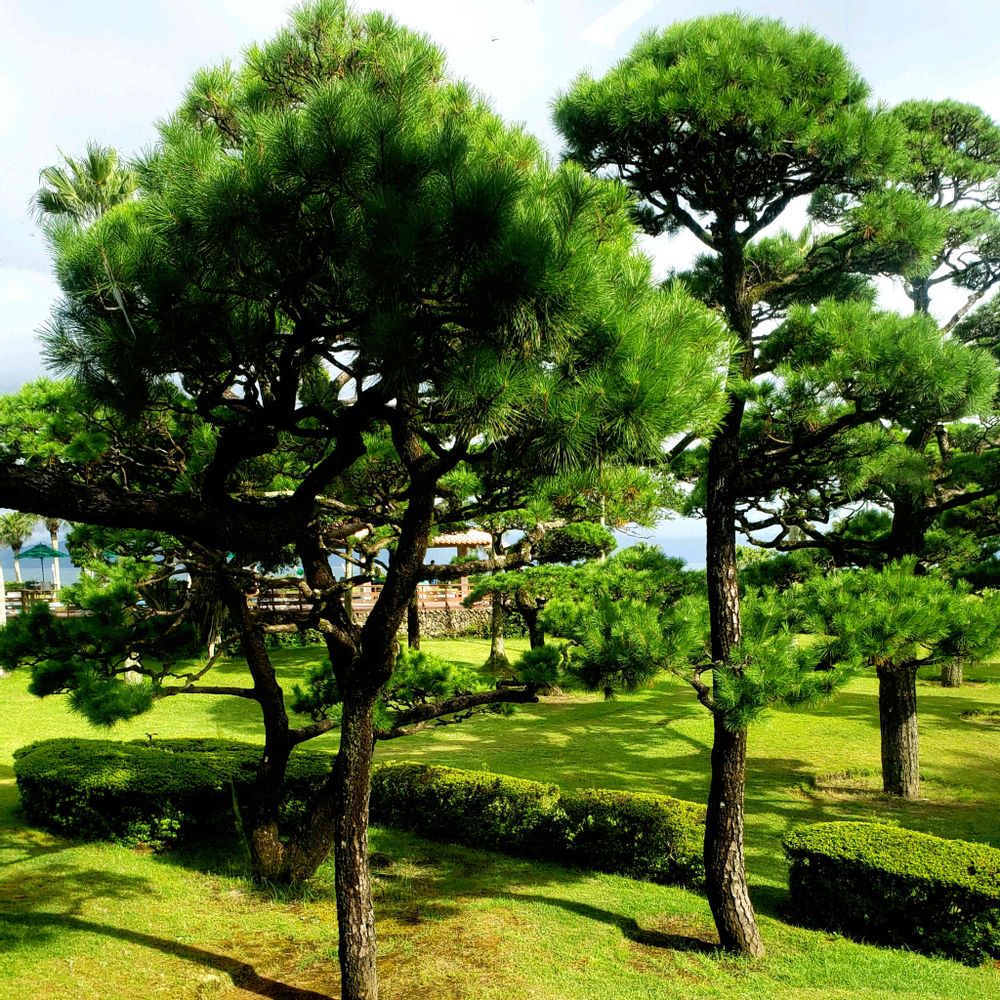 今年の夏 旅先のホテルで綺麗に整備された裏庭に植えられた松❗