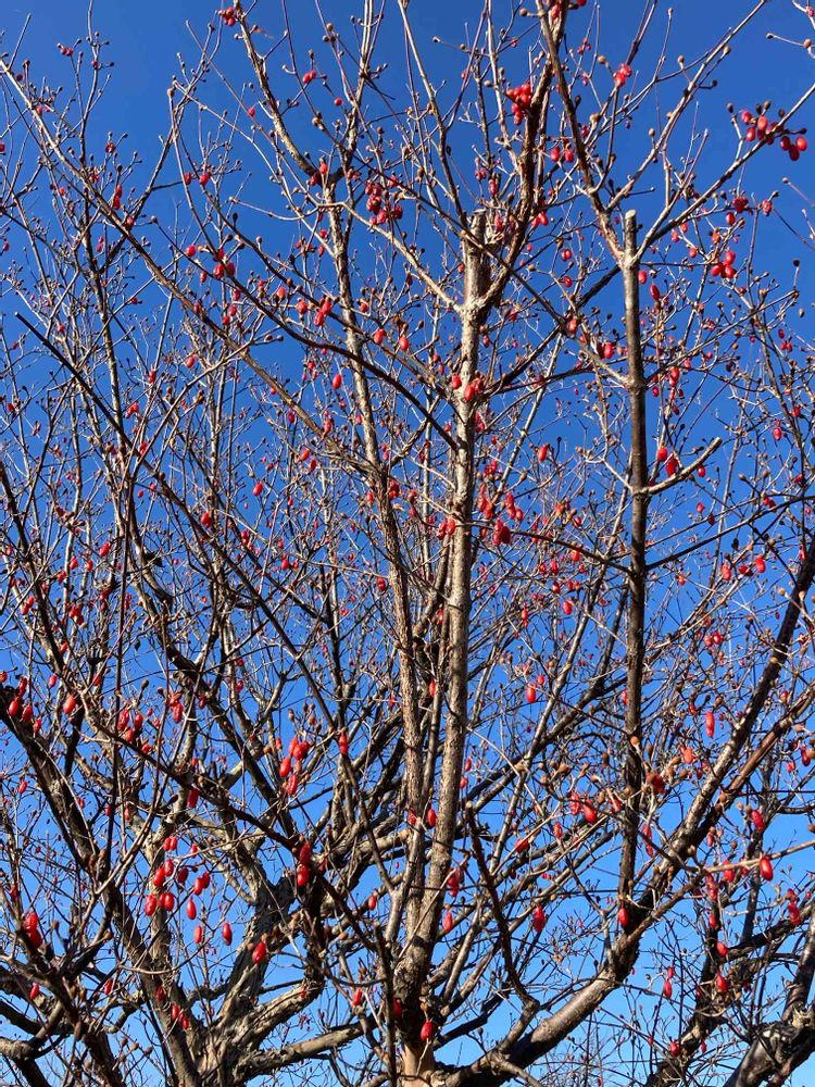 サンシュユさんは、春に黄色の小花が咲いて今頃まで赤い実がなってるんですね🍒