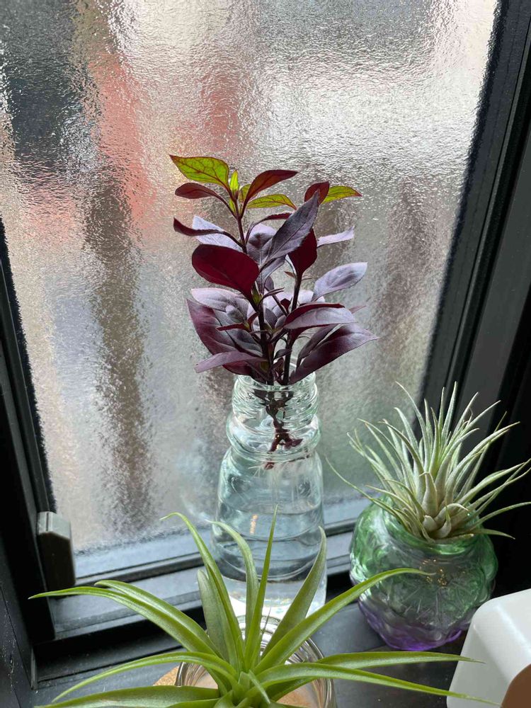 冬越し組、水挿しアルテラナンテラさん。新しいグリーンの葉っぱが出てきて、根っこも成長中♡