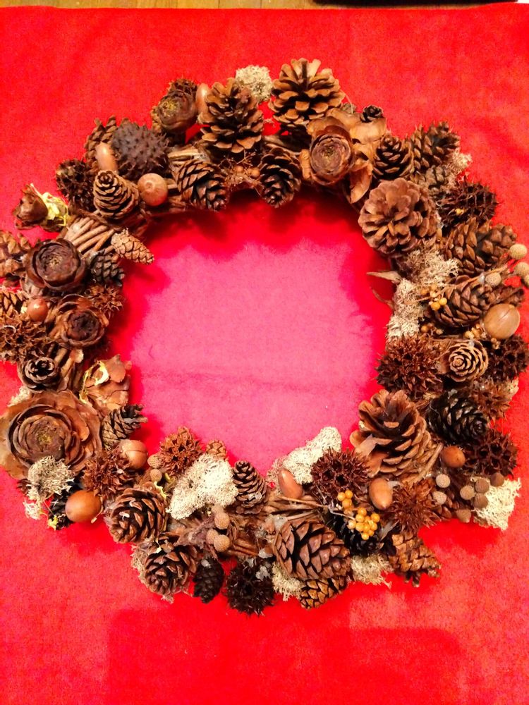 アケビの台に色々な種類のマツボックリをくっつけただけのリース