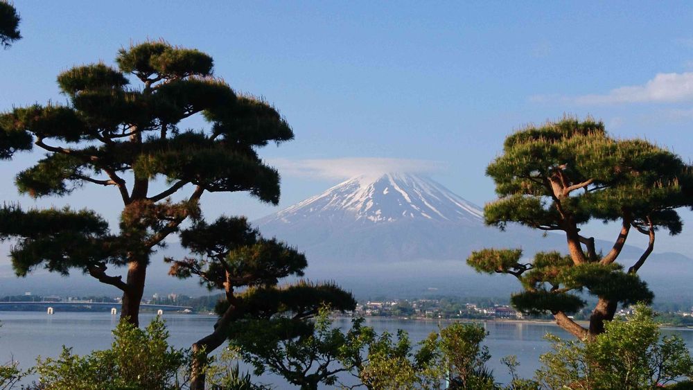 以前宿泊した河口湖畔のホテル庭園から松越しの富士山